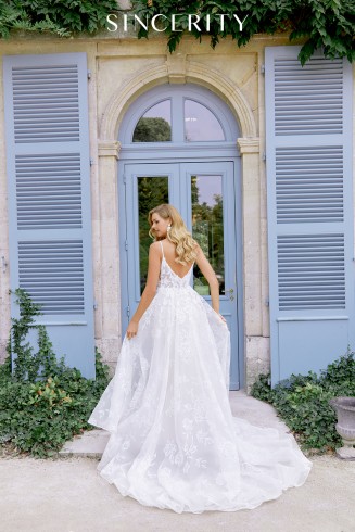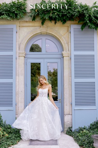 Robe de mariée en tulle à motifs floraux. Corsage ajusté avec de fines bretelles et encolure droite légèrement décolletée. Taille marquée ouvrant sur une jupe ample en ligne A, prolongée par une traîne fluide. Le dos présente une échancrure en V moyenne, soulignée par la transparence de la dentelle.