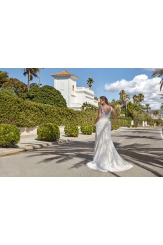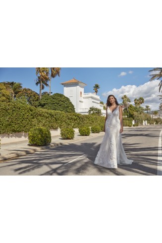 Modèle de robe sirène en dentelle et broderies appliquées. Le modèle présente un décolleté en V avec des bretelles en tulle transparent ornées d’applications de broderie. Le fond de la robe est travaillé en dentelle légère sur une base nude, le tout couronné sur le dessus par des appliques de broderies style végétal. La jupe suit une ligne sirène souple. Décolleté en V dans le dos également et petite lignée de boutonnage.