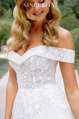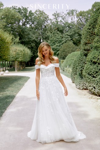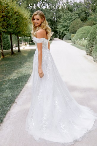 Magnifique robe présentant une silhouette A fluide avec un col bateau amovible en forme cœur. Une fois le col bateau retiré, on découvre un merveilleux bustier à pointes. Le corsage structuré, richement brodé avec sequins et petits détails 3D, souligne une taille bien marquée. La jupe légère et également ornée tombe avec naturel: comme vu sur les photos, ce modèle est disponible avec ou sans sa fente signature.